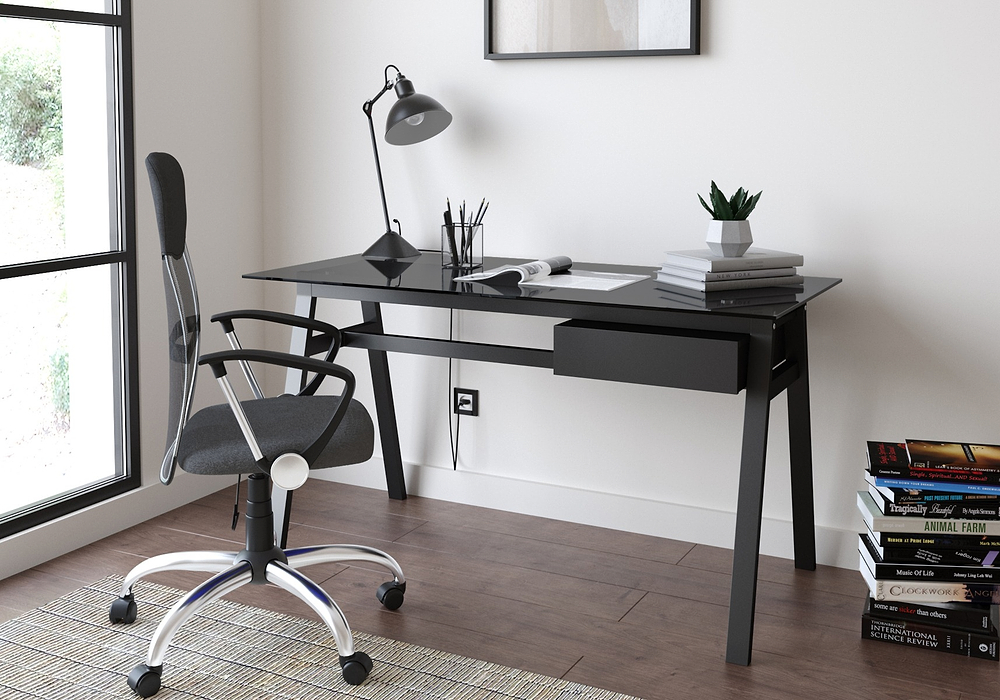 | Additional Features | • Stylish painted metal frame • Coloured glass worktop • Under desk Drawer • Working area: W 140cm x D 65cm |