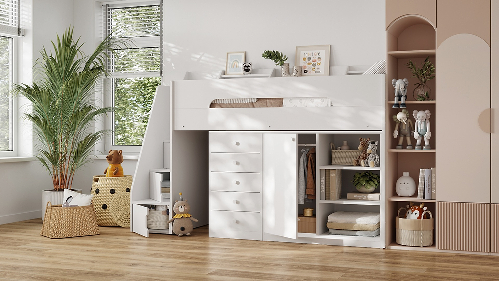 This high sleeper bed is perfect for kids who need plenty of storage for all their toys and belongings. It carefully crafted to offer both style and function, making it a great addition to any bedroom. With safety as a top priority, this bed features wide stairs that double as storage cabinets, providing extra space and stability when climbing up and down. The raised side panels ensure a cosy and secure sleep, while the staircase design is much safer than a traditional bunk bed ladder.
