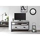 The unit’s chunky, lo-fi construction pairs a full-width media system shelf with a pair of metal-slide drawers – great for housing games and media controllers.
