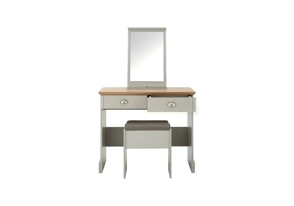 | Additional Features | • Oak-effect top • Upholstered stool in a soft grey • Matching mirror |