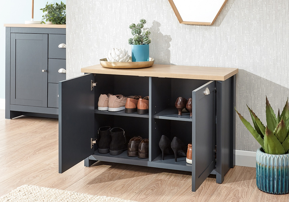 The slender design is ideal for siting against a wall and incorporates two twin-level shoe compartments.
