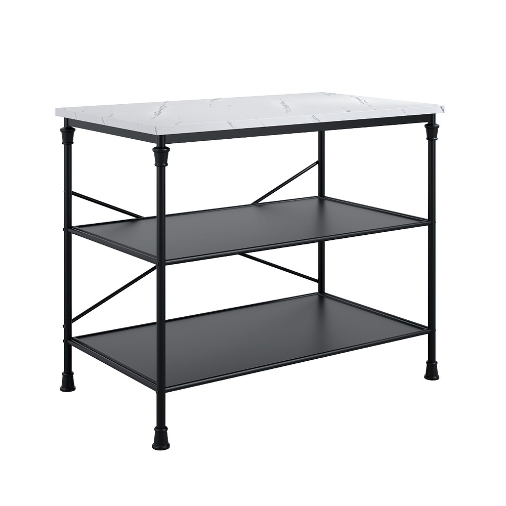 This kitchen island offers two spacious lower shelves, providing ample storage space for kitchen essentials, utensils, or decorative items. The sturdy black metal frame ensures durability, while the open shelving design enhances accessibility and functionality.