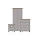 - Complete set: Includes a 2-door wardrobe, a 4-drawer chest, and a 2-drawer bedside table, all finished in a neutral grey with warm oak effect tops.