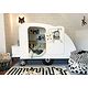 The door of the caravan can be fitted on either side of the frame according to your preference, and it features a personalisable nameplate at the front, adding a unique touch. This bed is part of a collection that evolves over time, embodying Montessori pedagogy principles with its scalable design, using kits that extend the furniture's longevity.