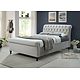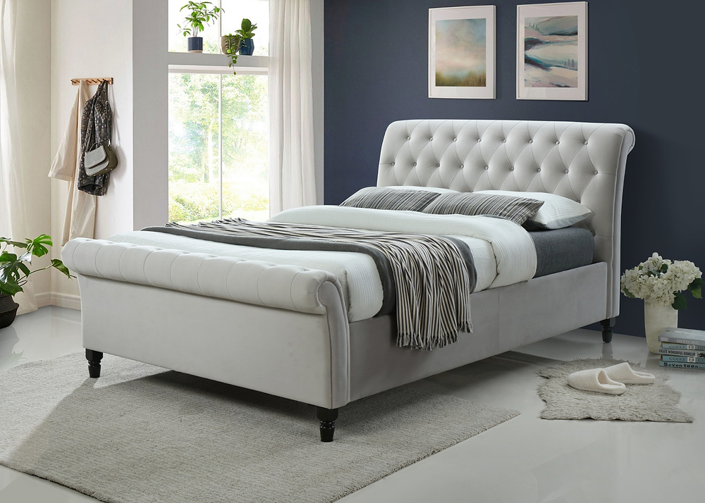 This lavish ottoman bed frame is exceptionally designed with exquisite, button and pleated fabric detailing, a tall headboard and gentle curves, which gives a more grand sophisticated look, while the studded details on the footboard add an extra touch of luxury.